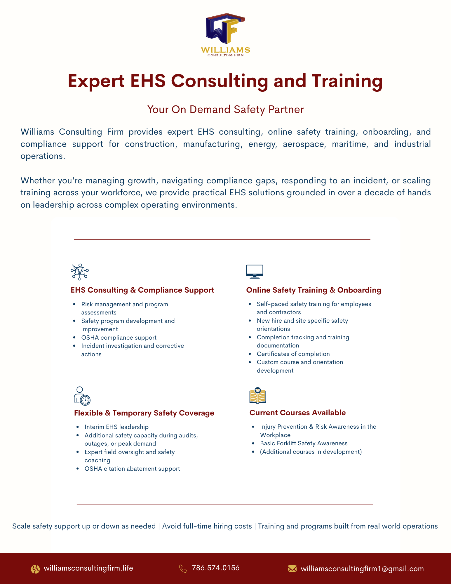 Williams Consulting Firm helps organizations reduce risk, navigate OSHA citations, and build stronger safety programs, without adding full-time headcount.