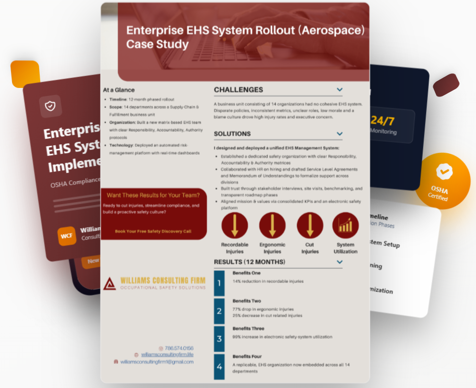 These case studies highlight real operational safety challenges solved across complex industrial environments. Williams Consulting Firm has supported organizations in aerospace manufacturing, energy infrastructure, logistics operations, and large-scale construction through regulatory response, incident investigation, safety system development, and operational risk reduction.